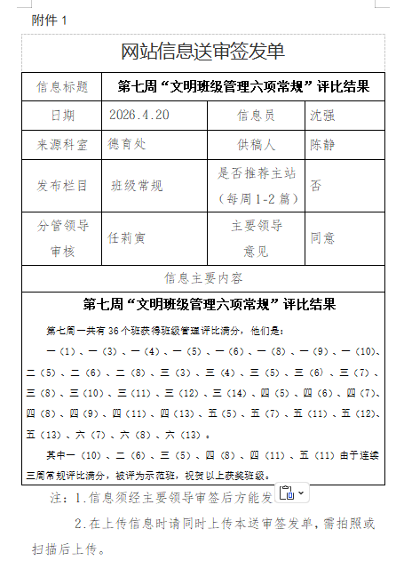 第七周班级常规六项评比结果