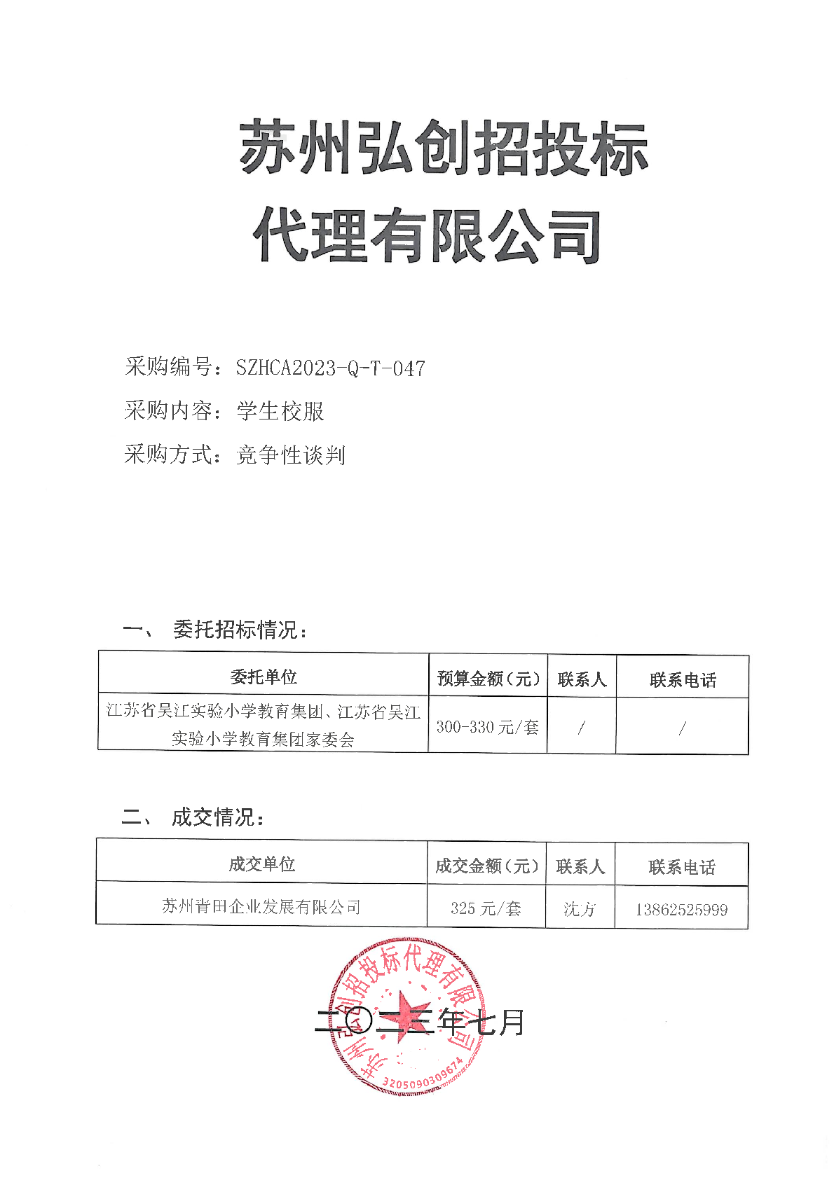 2023年学生校服招标结果公示