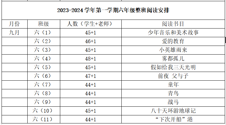 为培养学生爱读书的好习惯,拓展课外知识,营造班级浓浓的书香氛围,拉近教师与学生的距离,我校长期开展师生整班阅读活动。学校给每个年级每个班的老师和同学精心准备了课外读物,教师与学生在同一时间,同一地点,共读同一本书,分享喜欢的情节、谈谈读书的感受、朗读佳句佳段,师生共同读书就是营造了一种和谐、平等的读书氛围,在读书中共同享受美好。表格以六年级为例。