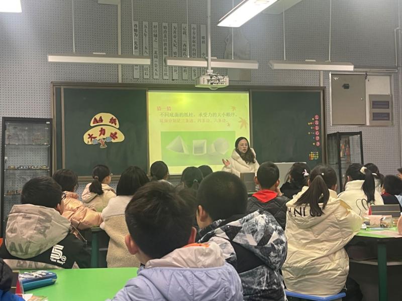 施叶娟老师根据教研组的安排,执教了《A4纸大力士》一课,施老师通过A4纸化身大力士、初探纸柱底面边数与承受力的关系、创意设计一个能承受更大重量的纸柱,循序渐进地引导探索A4纸的奥秘。学生在老师的引导下,随着任务的有序完成,掌握A4纸承重的秘诀,最后通过创意制作承重纸柱进行比赛。