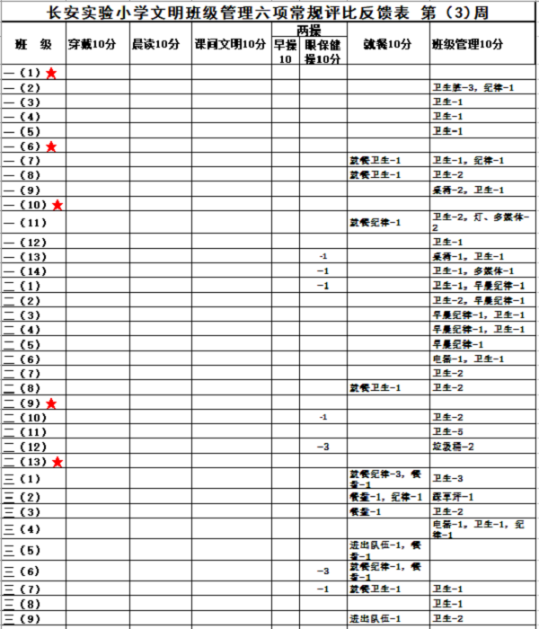 上周班级常规检查的主要问题是:早晨的纪律和教室卫生很糟糕,希望同学们在前一天的延时服务时不乱丢垃圾,爱护教室环境,春暖花正开,正是读书时!请同学们珍惜晨读的大好时光,读课本、读课外书,养成晨读的好习惯!班级荣誉靠大家,希望每个班级都能获得文明礼仪规范班,加油!
