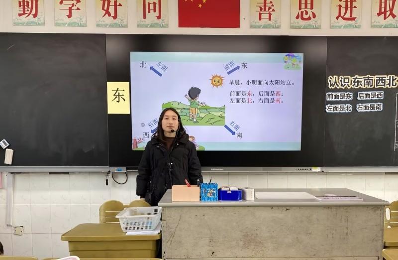 徐老师本节课的一开始,通过让学生一直向右转去认识东南西北,接着从孩子们的生活入手,出示了书本上的那幅小女孩放学的图。提出了“从图中你能知道哪个方向了吗?”可以让孩子们站一站女孩面向的方向得出面前是西,接着可以让孩子们掌握识别方向的方法。一是东与西相对,南与北相对。二是方向是按东南西北顺时针方向转的。先通过某些物体确定一个方向之后,从而确定其他三个方向。整节课,孩子们听的很认真。练习三可以让孩子们转一转书本(窗户朝南,)从而更快得出其余三个方向。